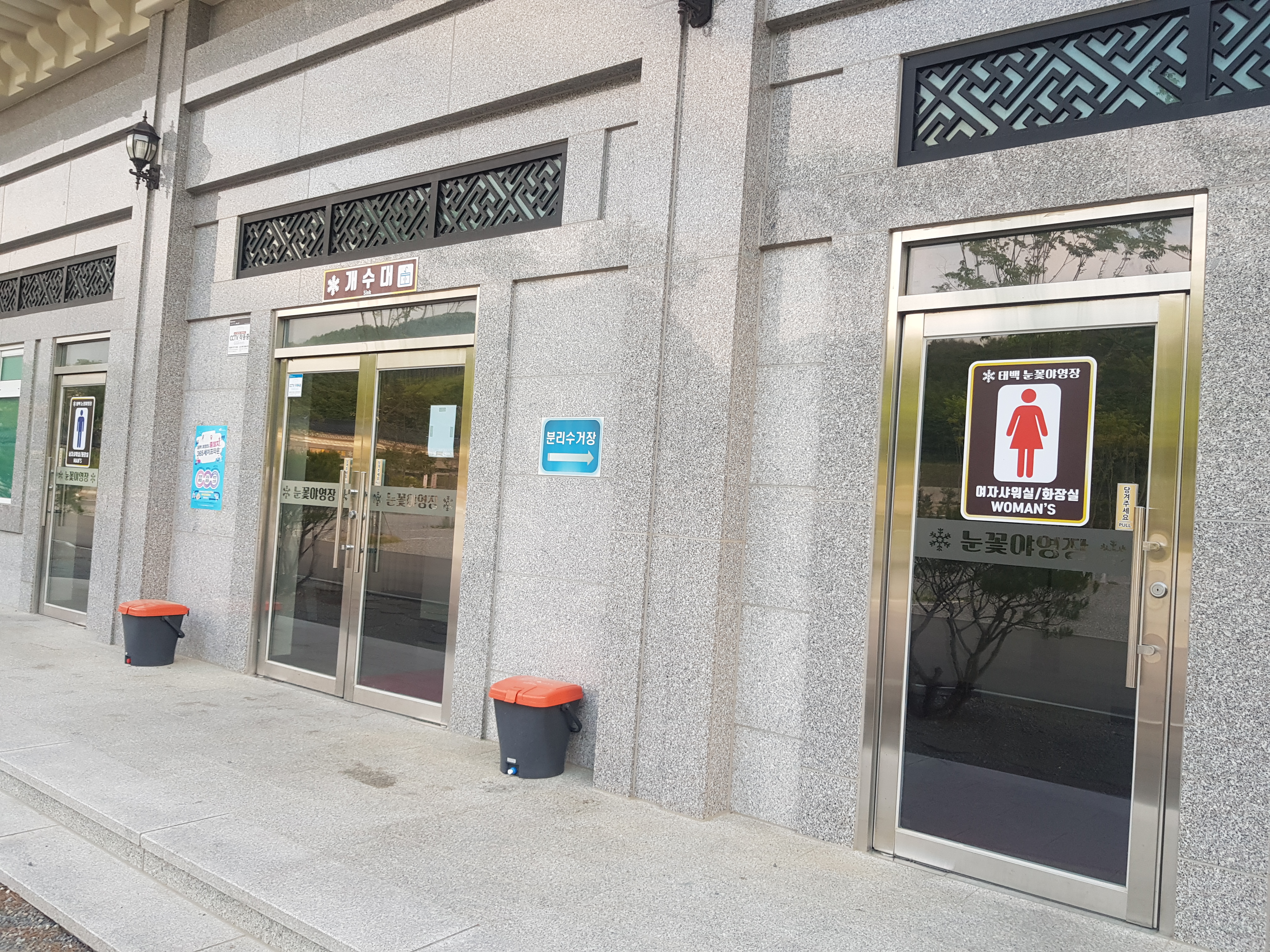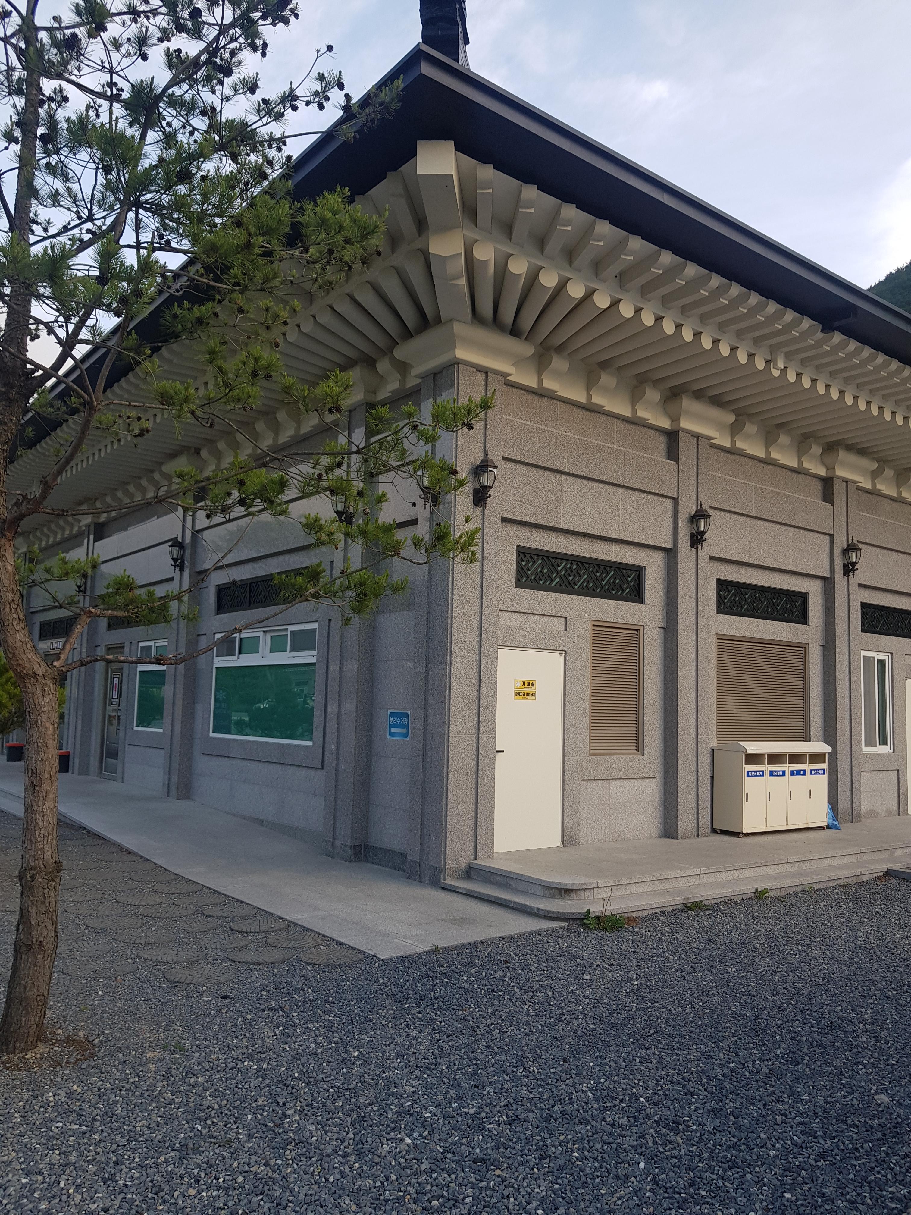 화장실 및 샤워장,개수대가 같은 건물에 있고 건물 옆에 분리수거함과 화로대를 청소 할 수 있는 공간도 있다